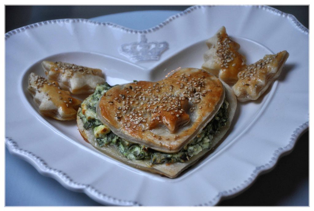 für die weihnachtliche variante blätterteigherzen oder sterne oder … ausstechen. für die füllung frischen spinat kleinschneiden und mit cremigen schafskäse vermengen.