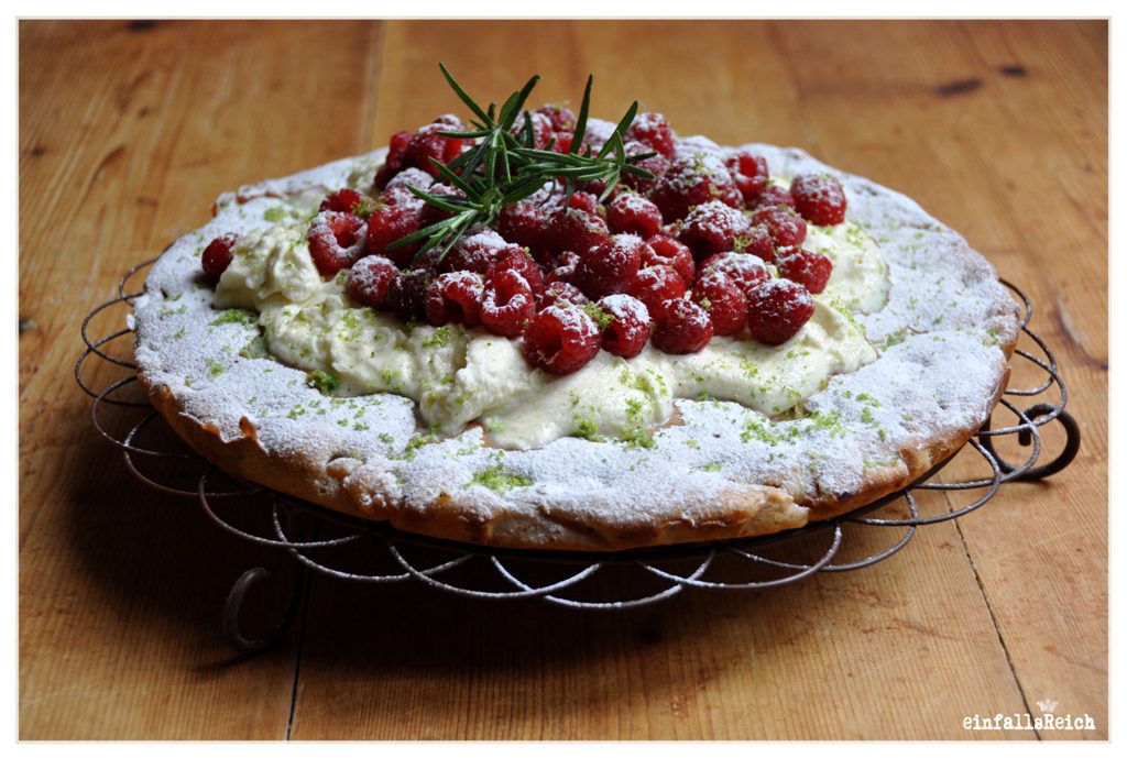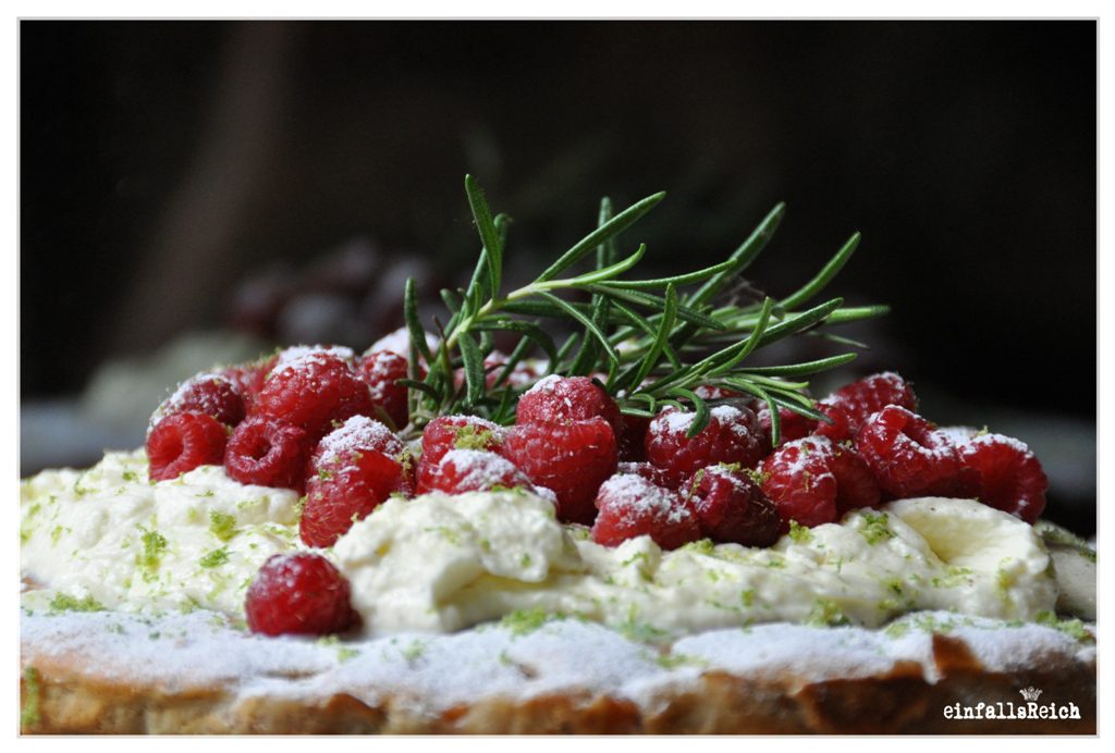 ehrlich gesagt, war das topping mit sahne und himbeeren „too much“ … es hat gut geschmeckt, aber es hat den zarten rosmaringeschmack vom teig erschlagen. meine freundin sylvia war dieses mal testesserin und wir beide befanden: einfach nur puderzucker auf den gebackenen kuchen … that`s it!