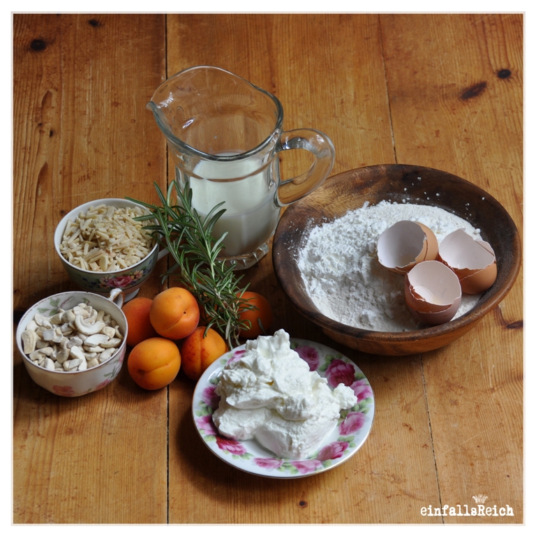 100g butter mit 2 eiern und 200g zucker schaumig schlagen. nach und nach 230g mehl, 300g magerquark, 150g gehackte mandeln und cashewkerne, 3 el stärke, 1 paket backpulver, 160ml buttermilch und 1-2 el gehackten rosmarin unterrühren.