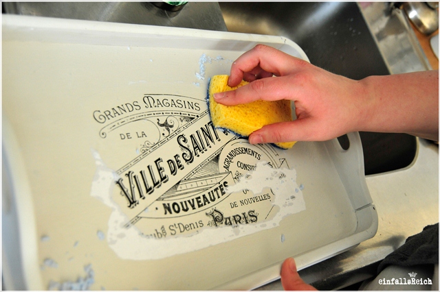 sucht euch ein motiv eurer wahl (unseres ist von hier the grafics fairy) und druckt es spiegelverkehrt, in der größe die ihr benötigt, aus (achtung!!! geht nur mit kopien von einem laserdrucker). das gewählte objekt, in unserem fall ein kleines tablett, großzügig mit dem transferlack (wir haben den lack bei idee gekauft, gibt es aber überall auch im netz) einstreichen. das motiv bzw. die motivseite ebenfalls bestreichen, auflegen und glatt streichen… dann laut anleitung 24std. trocknen lassen… wer bitte hat denn so viel geduld??? wir haben die geschichte trocken gefönt! dann mit einem wassernassen schwamm das weiße papier abrubbeln und somit das motiv frei legen. wenn es trocken ist, kann das motiv mit dem gleichen lack nochmal übergestrichen werden oder wie auf dem folgenden video mit vaseline eingerieben werden.