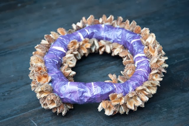 was ihr benötigt sind viiiiiele dieser hübschen bucheckern, eine klebepistole und einen kranzunterbau. meiner ist aus alter zeitung gedreht und mit klebeband umwickelt. sieht man hier…