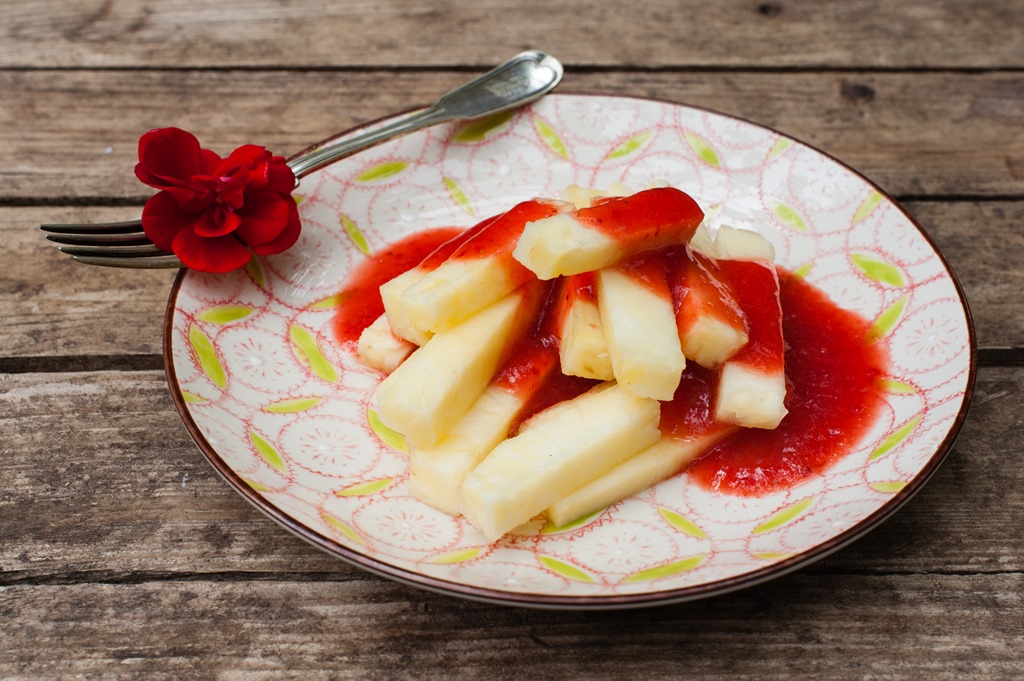 ananas in pommesähnliche stücke schneiden, erdbeeren pürieren und als ketchup darüber geben. wem es nicht süß genug ist, entweder ein bisschen banane mit hinein oder agavensirup.