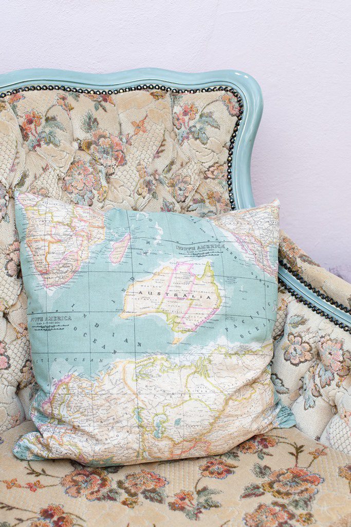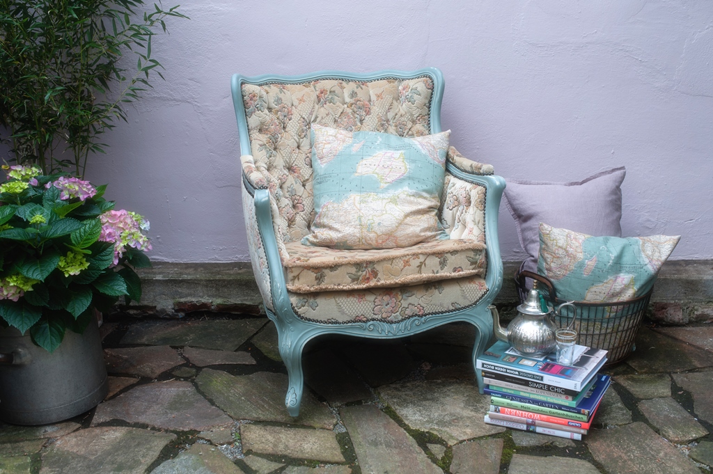 Dein neuer Sessel ist wundervoll! Diese Mischung aus Blümchenstoff beim Bezug und dem Weltkarten-Stoff beim Kissen ist genial!