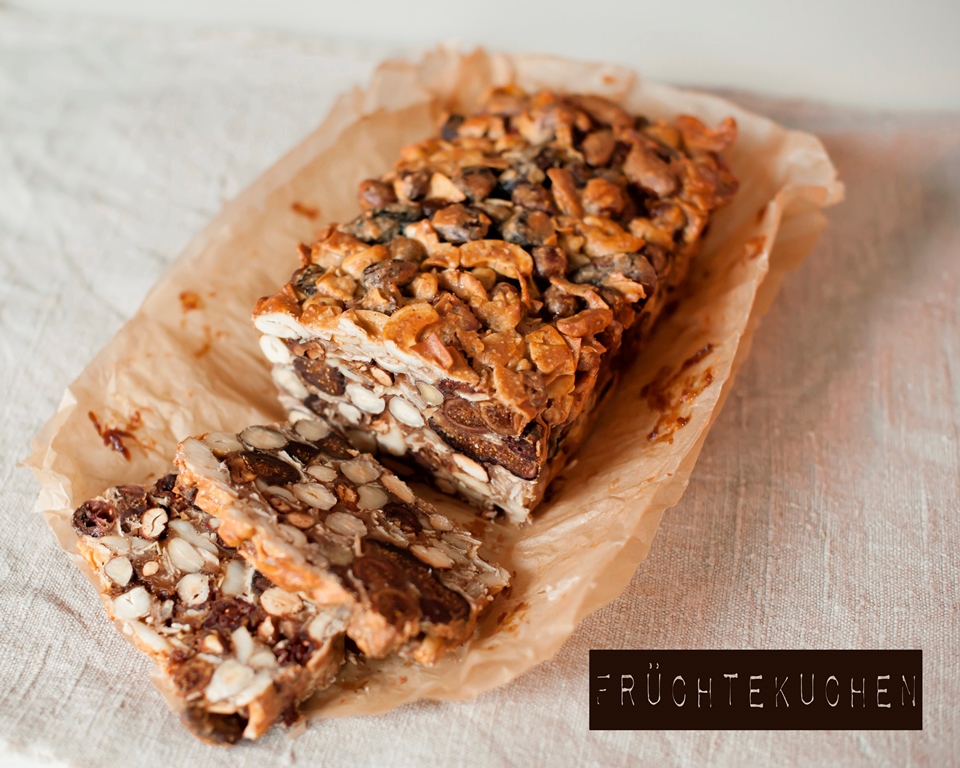 100g mehl, 80g zucker, 1 tl zimt, 1 tl nelkenpulver, 1 tl ingwerpulver, 1 prise salz mit insgesamt 350g nüssen eurer wahl und 700g trockenfrüchte eurer wahl miteinander vermengen. 3 eier verquirlen und dazugeben,