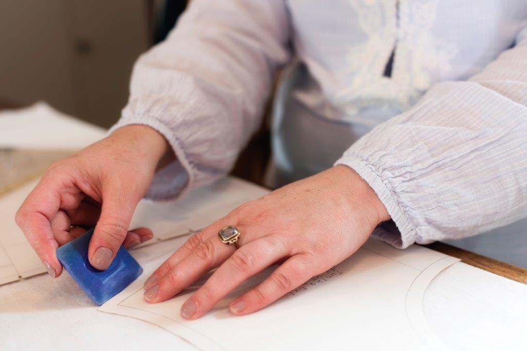 Schon sind die ersten Vorbereitungen im Gange… Stoff ausbreiten, Schnittmusterteile auflegen, mit Schneiderkreide umzeichnen und anschließend zuschneiden…