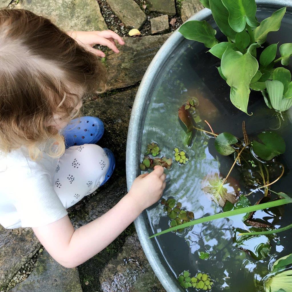 Wenn im Garten kein Platz ist für eine Teichlandschaft, ich habe nämlich nur einen winzigen Hofgarten mitten in der Stadt, ist so ein Miniteich in einem Gefäß eine schöne Alternative. Und zudem ein schnelles schönes Projekt mit den Kindern/dem Enkelkind.