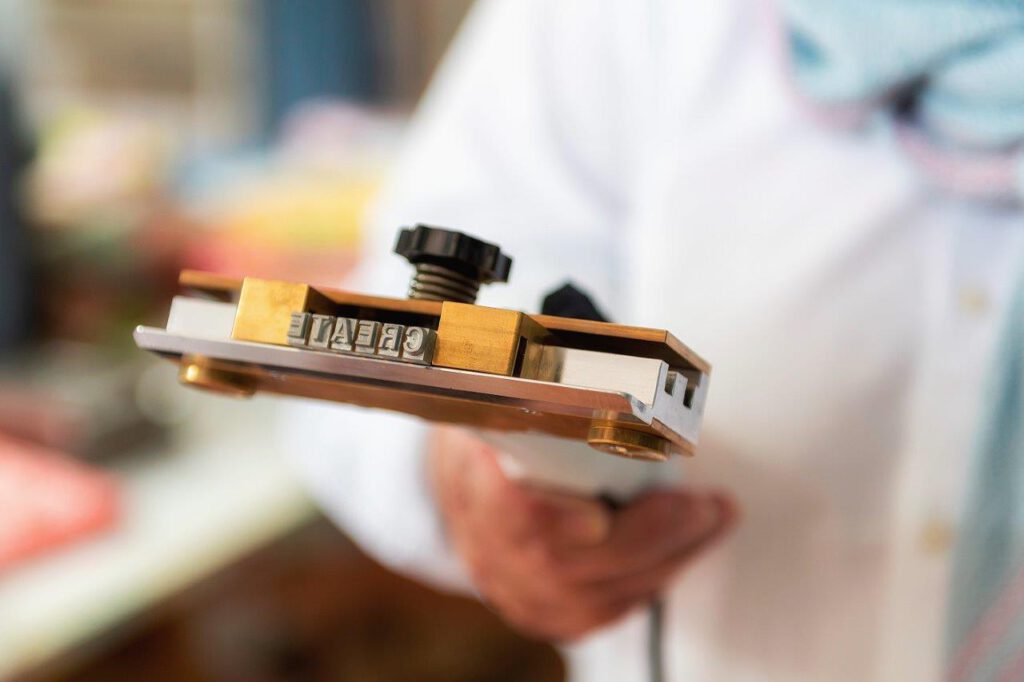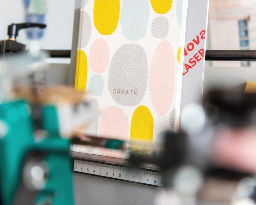 Für den Abschlussprozess erwartete unsere Bücher noch ein tolles Highlight… Sylke zeigte uns ihre neueste Errungenschaft, eine Prägemaschine, mit der Bücher und Kästchen z.B. durch Namen personalisiert werden können. Wir entschieden uns für das Wort „create“ auf unseren Buchcovern.